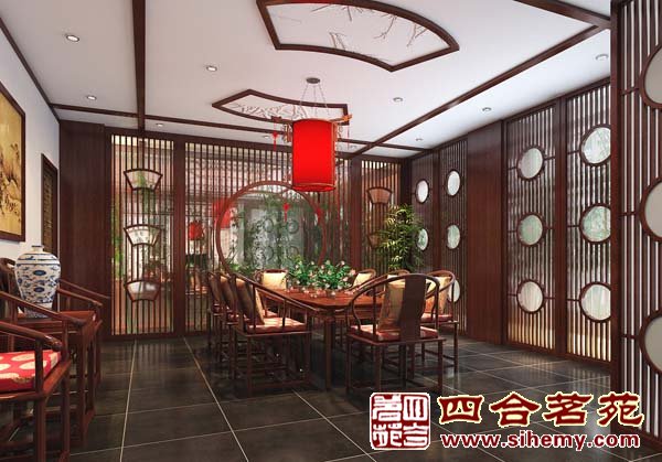 雅間二:雅間靠窗的花格可從月門出,將后面窗戶開啟。當微風輕拂,透過白沙,竹影朦朧飄渺,好像賦予了天棚上雕刻竹簡生命,回味無窮。房間整體設計,采用園林式借景為背景,意境深遠,淡定,輕松。